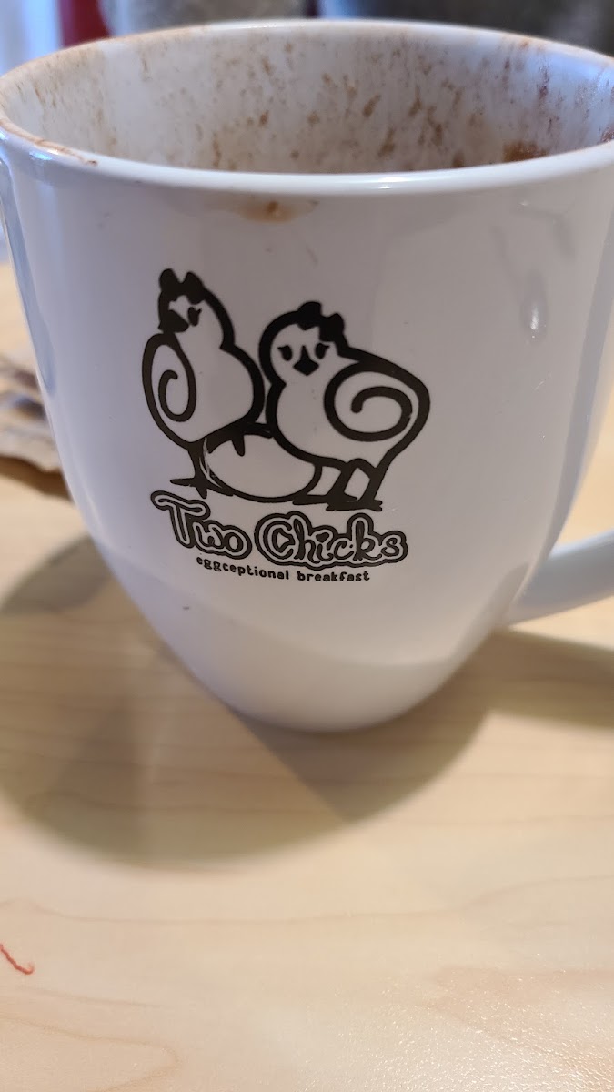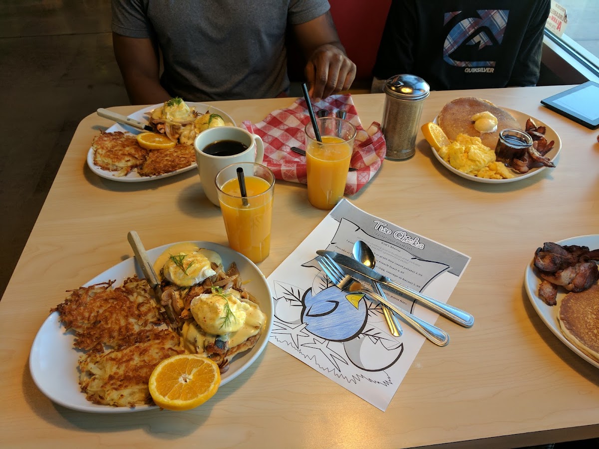 This is one of the best breakfasts I’ve had in a long time! I loved the white, sweet potato, with bell pepper and onions, my bacon was cooked exactly like I asked a little crispy. They have different flavored mimosas and breakfast drinks ! Service was fast, the waiters and waitresses continue to check on me and make sure my meal was good. They were very attentive! There was a little bit of a wait for a table, so I just set up at the bar, which was fabulous! I got to watch the cooks cook and I was amazed with one cook was so good. I definitely recommend breakfast here at two chicks.!